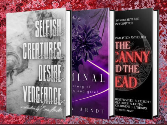 THE UNCANNY AND THE DEAD: a horror anthology of mortality, memory, and transformation, featuring tales of tormented souls, eldritch horrors, and the unquiet dead. The stories range from eerie and unsettling to lighter paranormal with a noir edge, from psychological horror to body horror, written in American and British English.LIMINAL: a story of ghosts and grief. After the devastating death of her partner, a woman struggles with her loss.SELFISH CREATURES DESIRE VENGEANCE: A collection of poetry tackling religious, familial, and gender dysphoria.